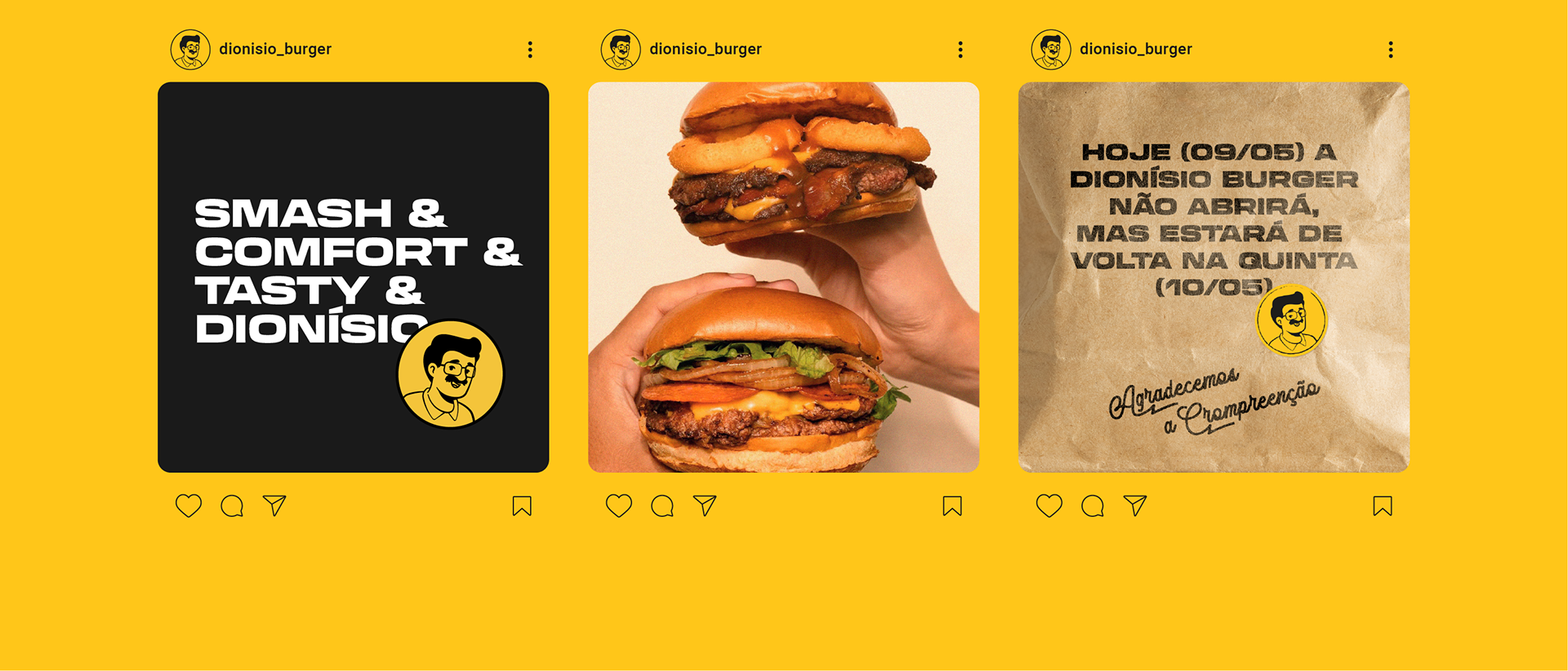 Mesmo sem um espaço físico, Dionísio Burger foi pensada como uma comunidade. O projeto apresenta o desenvolvimento completo da marca; posicionamento, identidade visual e tom de voz. Traduzindo em estratégia e design aquilo que a marca acredita: todo mundo se conecta pelo amor a um bom hambúrguer.